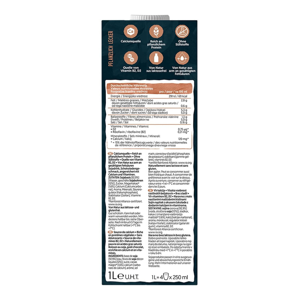 Alpro Proteindrink Soja Chocolate è una bevanda proteica 100% vegetale, dedicata a chi evita i latticini ma desidera un ricco apporto proteico. Con un gusto equilibrato di cioccolato e una pratica confezione da 8 x 1 L, è la scelta ideale per la colazione, gli spuntini o i frullati quotidiani.